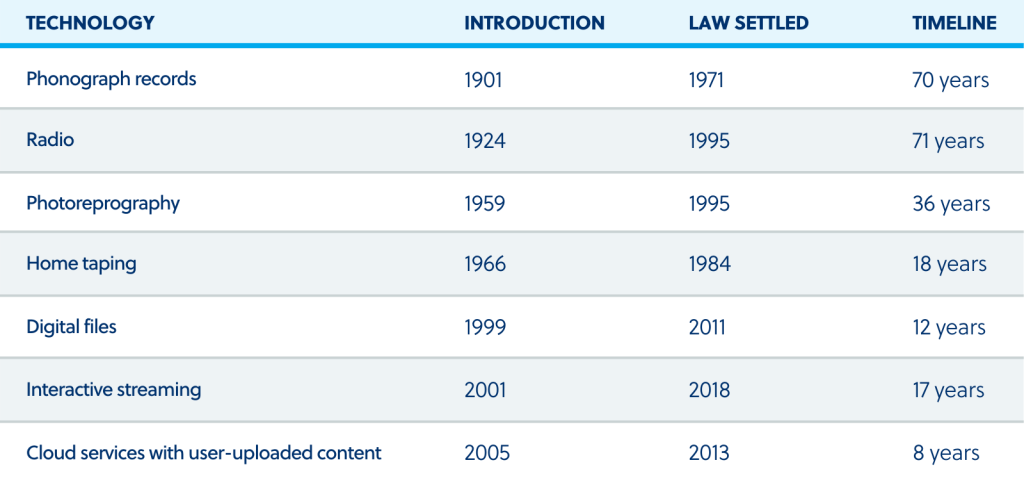 The following table summarizes the disruptive technologies discussed here and the timelines to the settlement of copyright law around them. It shows that the law took less time to settle during the heyday of consumer electronics and analog media than it did with the phonograph and radio technologies that first appeared before consumer electronics were widespread, and that it took less time to settle during the digital age than during the age of analog consumer electronics.