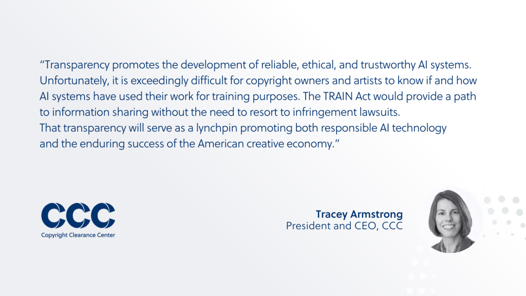 CCC supports the Transparency and Responsibility for Artificial Intelligence Networks (TRAIN) Act introduced by United States House Representatives Madeleine Dean (D-PA) and Nathaniel Moran (R-TX). This bipartisan bill enables copyright owners to know if their work has been used to train AI models through access to training records.