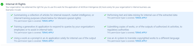 Secondly, we are making it even easier to show AI rights and permissions covered by companies’ own direct agreements with publishers with an additional custom rights configuration capability, whether those rights are the same, similar, or different from the coverage CCC’s licenses offer.